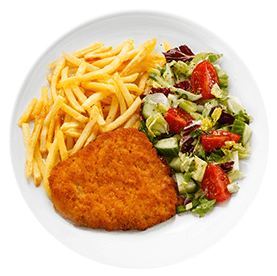 Steaks, salade, tomates, maïs, olives, frites. + Cheese naan.