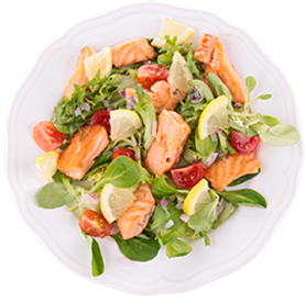 Salade, tomates, saumon fumé, maïs, olives. + Cheese naan.
